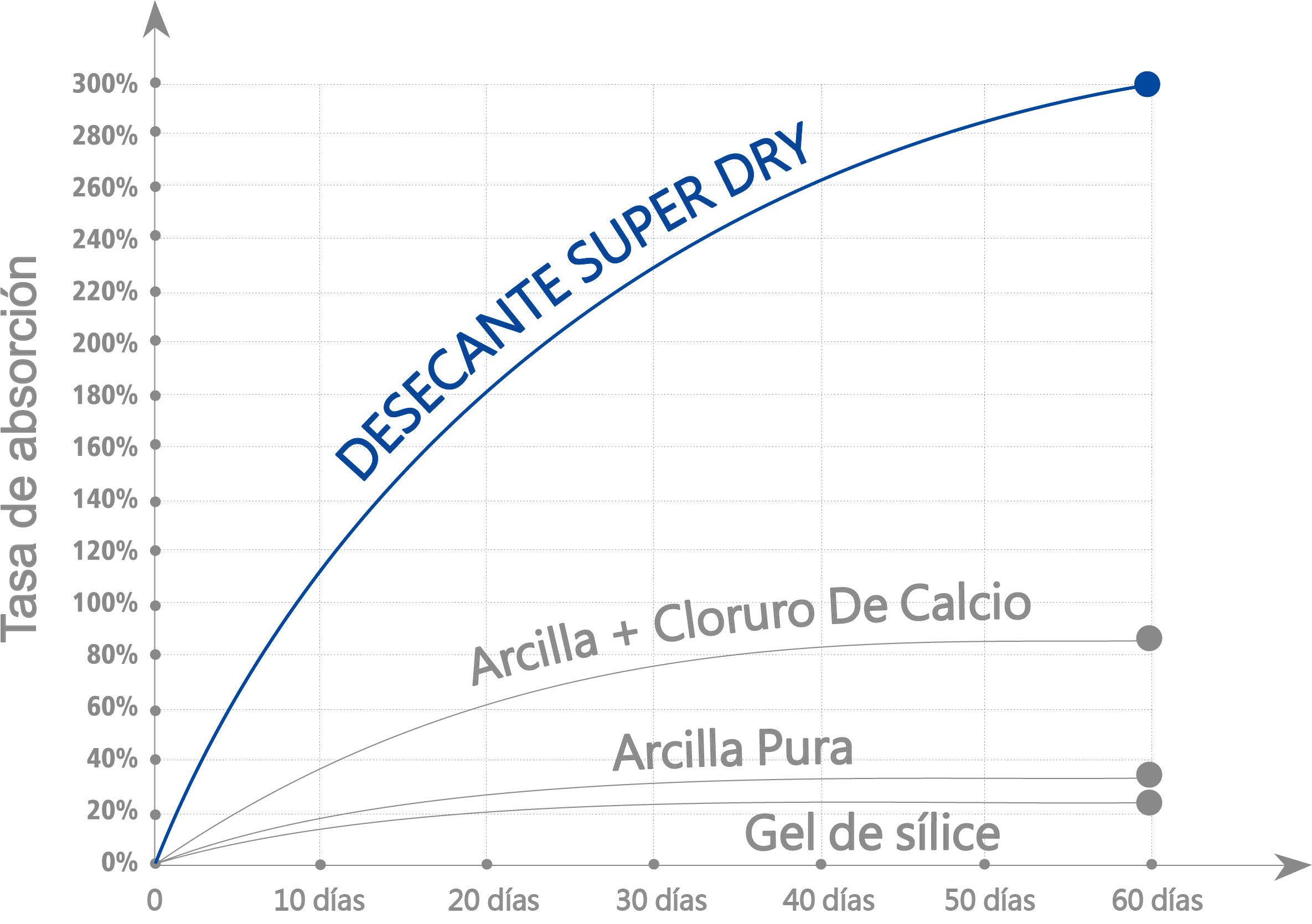 Los desecantes SUPER DRY tienen una capacidad de absorción verificada de más del 300% de su peso en seco y absorben la humedad de forma continua hasta 90 días en condiciones de temperatura que oscilan entre -5°C y +90°C.