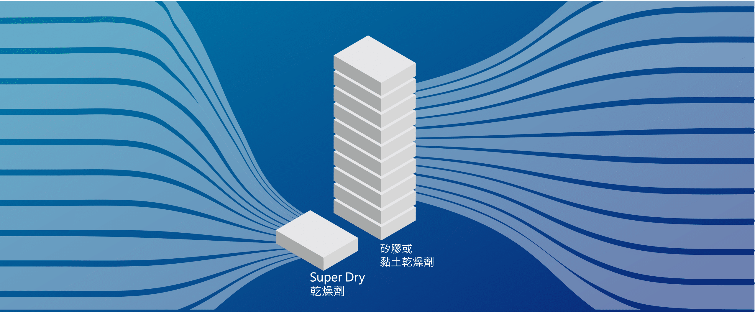 SUPER DRY 乾燥劑經驗證,其吸收能力超過其淨重的 300%,並可在 -5°C 至 +90°C 的溫度下連續吸收水分長達 90 天。