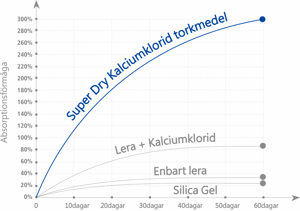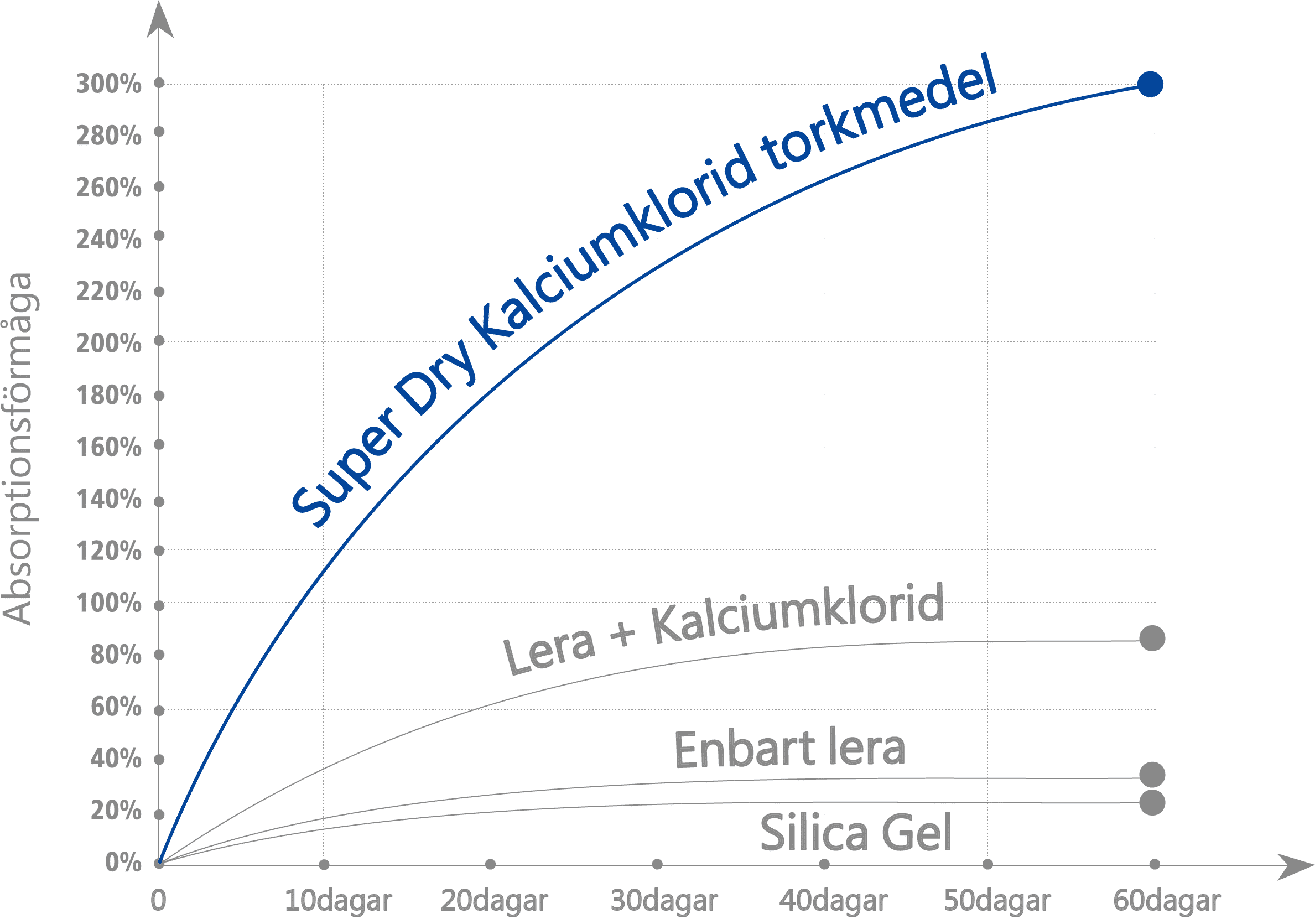 Super Dry’s torkmedel har en verifierad absorptionskapacitet på mer än 300 % av sin torrvikt och absorberar kontinuerligt fukt i upp till 90 dagar i temperaturförhållanden som sträcker sig från -5 °C till +90 °C.