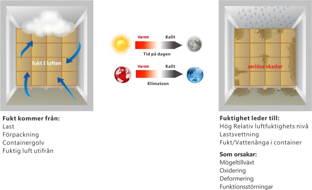 Varor som transporteras i sjöcontainrar är särskilt utsatta eftersom containrar erbjuder ett idealiskt mikroklimat som ökar risken för fuktskador. Under en sjötransport varierar temperaturen i containern kraftigt. En temperatursänkning leder till kondensation av vatten, eftersom kall luft lagrar mindre vatten än varm luft.